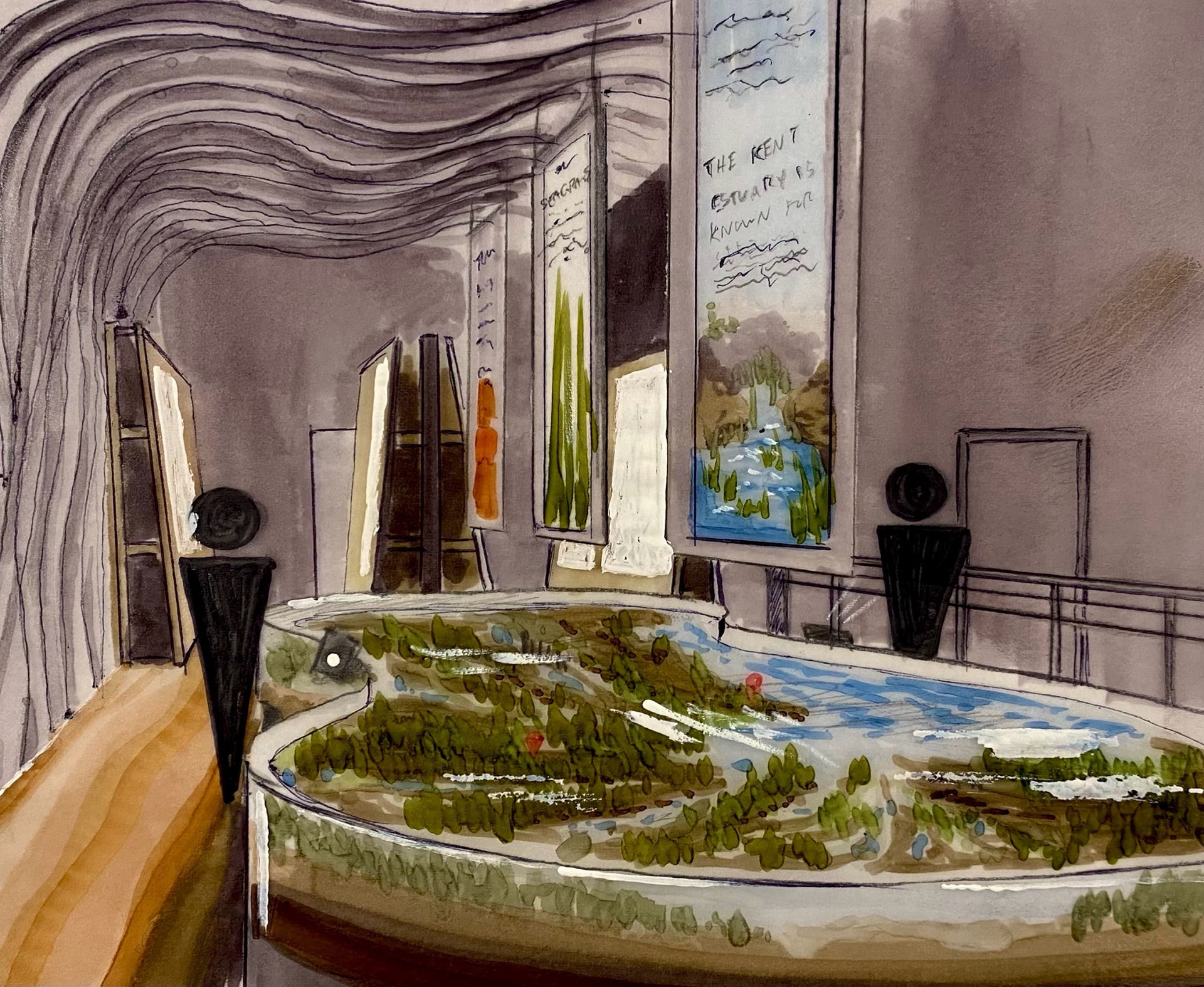 Spatially, grand ‘turning points’ disperse into intimate educational exhibits, mimicking the estuarian midpoint between waterways and the big blue.