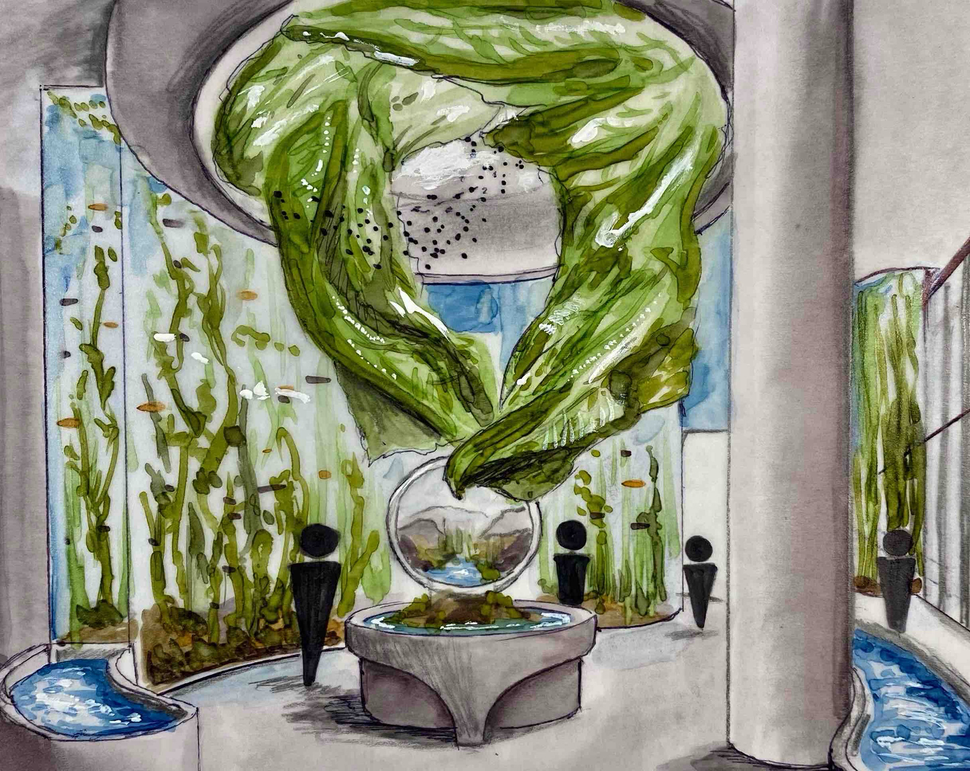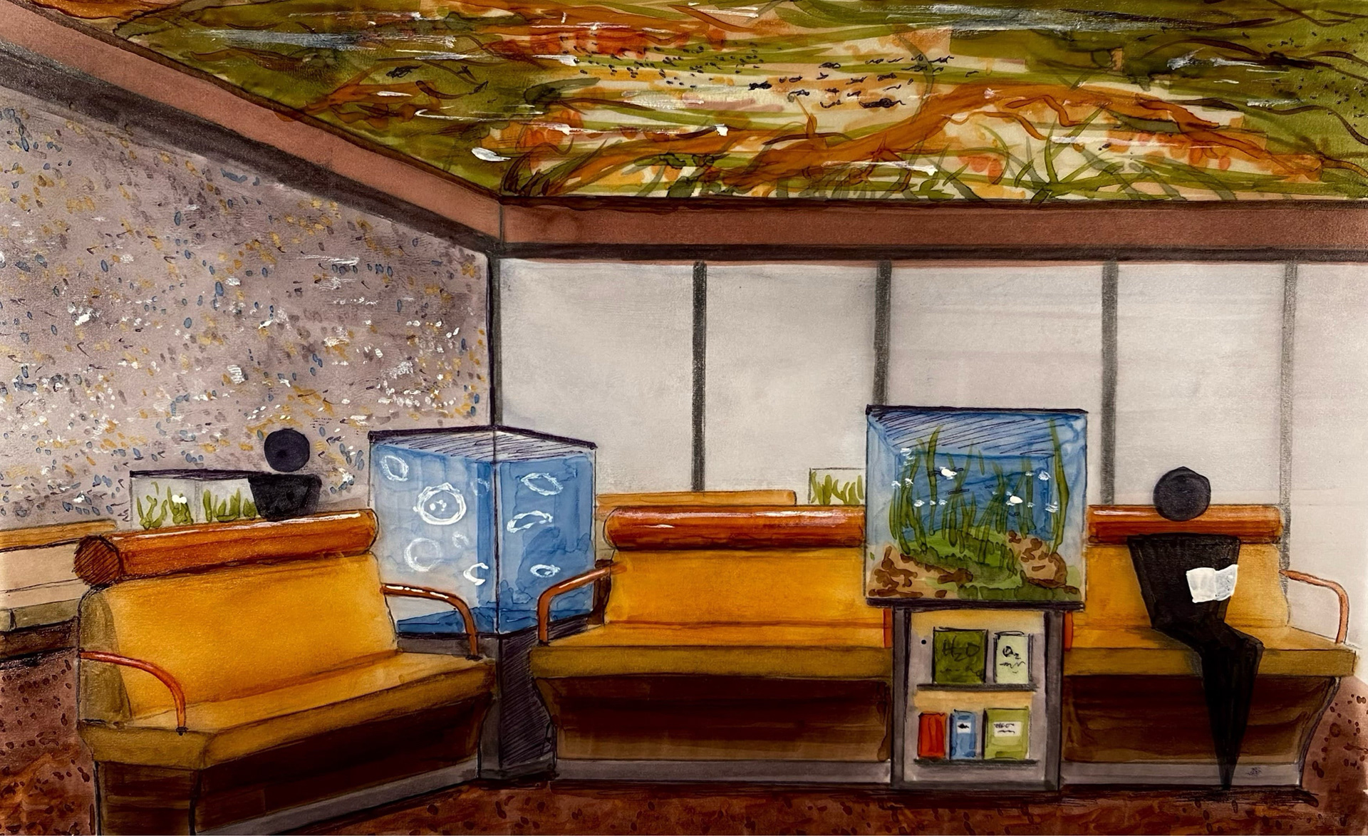 A moment for self education, with a scattering of amoeba-inspired sofas, close encounters with smaller marine life, all under a red kelp aquarium ceiling.